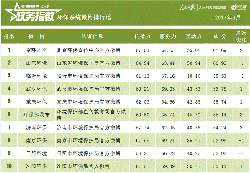 2017年3月,根据新浪-政务指数-环保系统排行榜,@京环之声位于榜首。