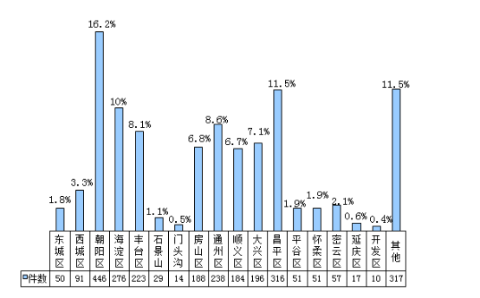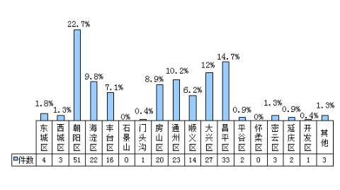 2017年6月群众通过“12369环保微信举报平台”反映环保诉求数量较多的是朝阳区、昌平区、大兴区、通州区和海淀区,占微信投诉举报量的69.4%。
