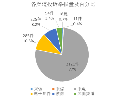 受理的环保投诉举报事项按受理渠道分:来访18批19人次、来信11件、来电2121件、电子邮件285件、微信225件、其他渠道94件。