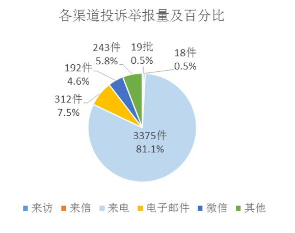 受理的环保投诉举报事项按受理渠道分:来访19批26人次、来信18件、来电3375件、电子邮件312件、微信192件、其他渠道243件。
