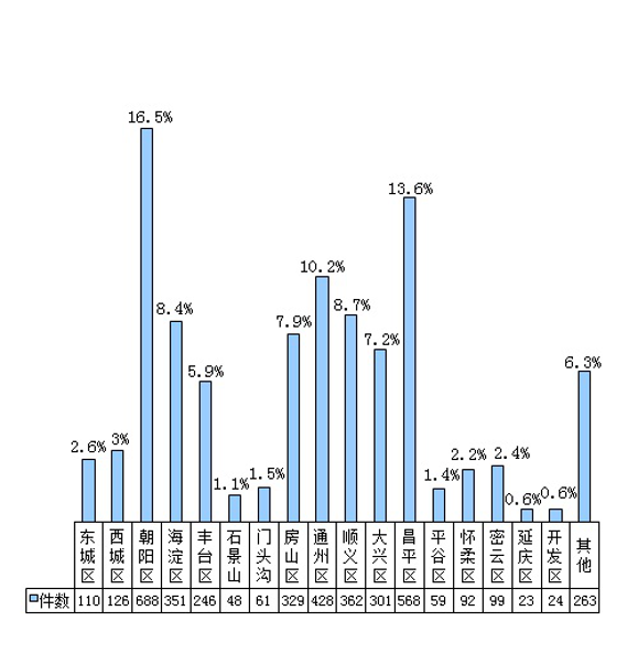 2017年9月,办理群众反映的环保诉求数量较多的分别是朝阳区、昌平区、通州区、顺义区和海淀区。