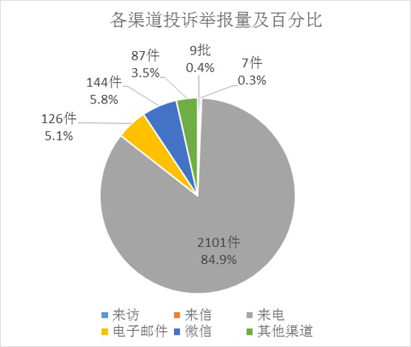 受理的环保投诉举报事项按受理渠道分:来访9批10人次、来信7件、来电2101件、电子邮件126件、微信144件、其他渠道87件。