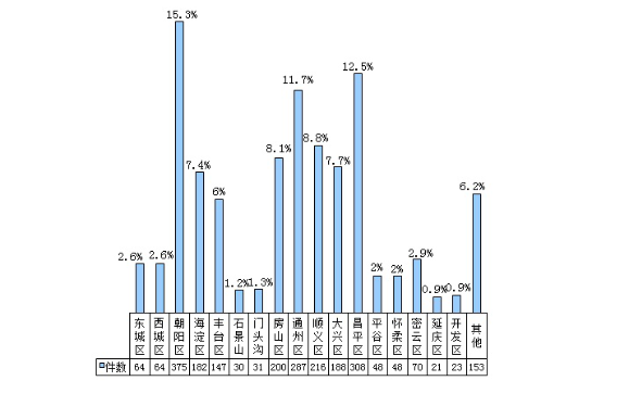 2017年10月,办理群众反映的环保诉求数量较多的分别是朝阳区、昌平区、通州区、顺义区和房山区。