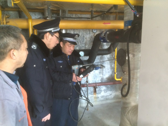 执法人员和监测人员对燃气锅炉污染物排放情况进行检查