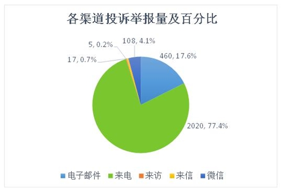 受理的环保投诉举报事项按受理渠道分:来访5批10人次、来信17件、来电2020件、电子邮件460件、微信108件。