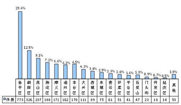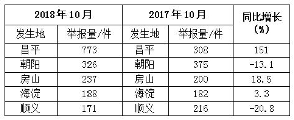 2018年10月,办理群众反映的环保诉求数量较多的分别是昌平区、朝阳区、房山区、海淀区和顺义区。