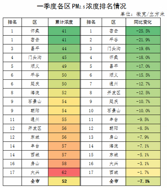 在空气质量方面,一季度,大兴、房山、西城等区PM2.5平均浓度较高,超过全市平均浓度水平。
